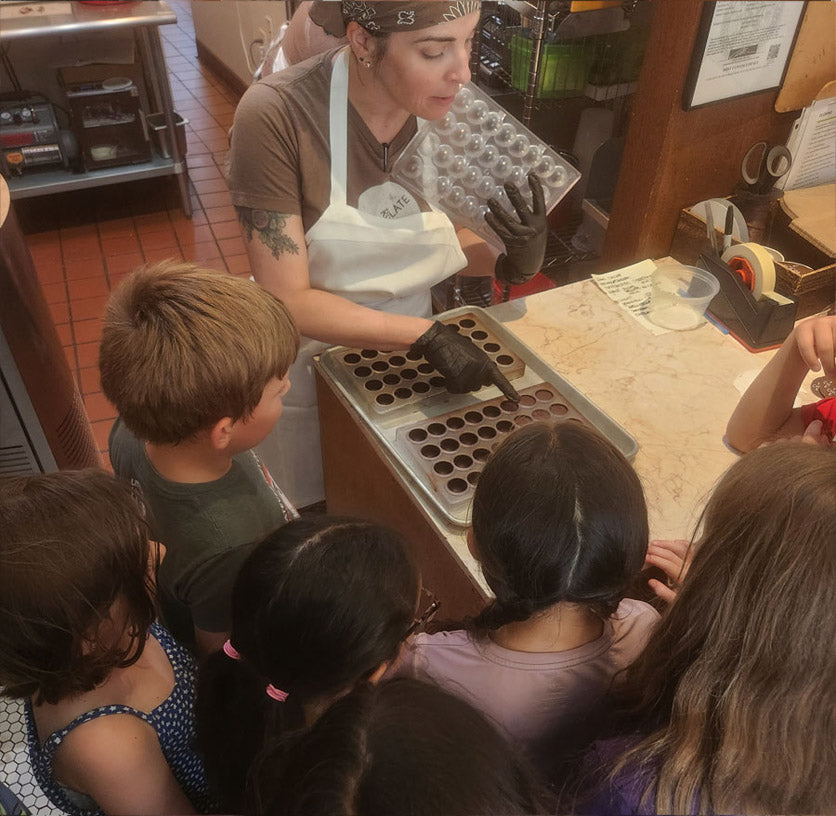 | During these visits, we enjoy sharing our history, production processes, and of course, offer a taste of something special. Sometimes it’s our decadent Belgian Chocolate sorbet, a hand crafted and painted bonbon, or a seasonal special. Sometimes the group will partake in our latest collaboration with a local brewery, whiskey distillery, honey maker, or taste an exclusive Starbucks chocolate that we’ve created for The Starbucks Reserve Roastery in Manhattan: it might include a Coffee Creme Caramel or Cold Brew bonbon. The tours bring guests from around the world. We’ve met travelers from New Zealand, Japan, Israel, England, South Africa, Texas, California, Canada, France, Australia, and beyond! And with all of our cultural, intellectual, or political differences, we know that one thing we all can enjoy together is CHOCOLATE! It is our unifying commonality and with it we enjoy connecting with the global community. As they sample our dark chocolate sorbet, bonbons, or now our famous chocolate cupcakes, there is a universal joy that we see on visitor’s faces that help make our days meaningful. The smiles that result are a universal joy, and it’s such a delight to witness. |
